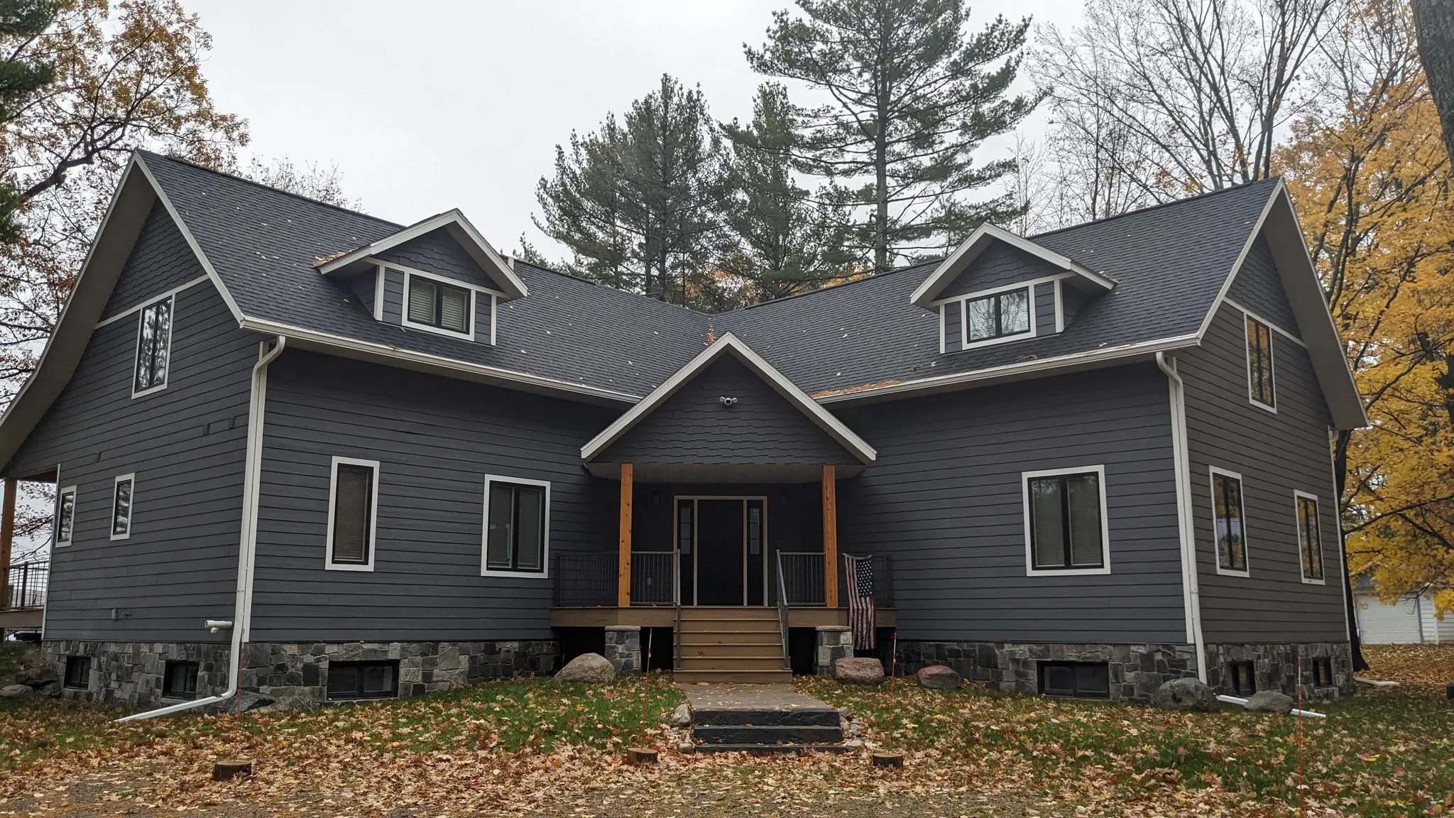 Designed by Trout Creek Drafting & Design and constructed by Monk Construction LLC., this lake house near Rhinelander is 100 percent completed after installing the entry door ordered nearly one year prior, a few supply-chain issues from COVID. Black siding, roof, windows, black everything except the cedar deck and wood tone doors. Contact us if you're thinking of building a home or cottage in the Northwoods...we'd be happy to design your dream home!